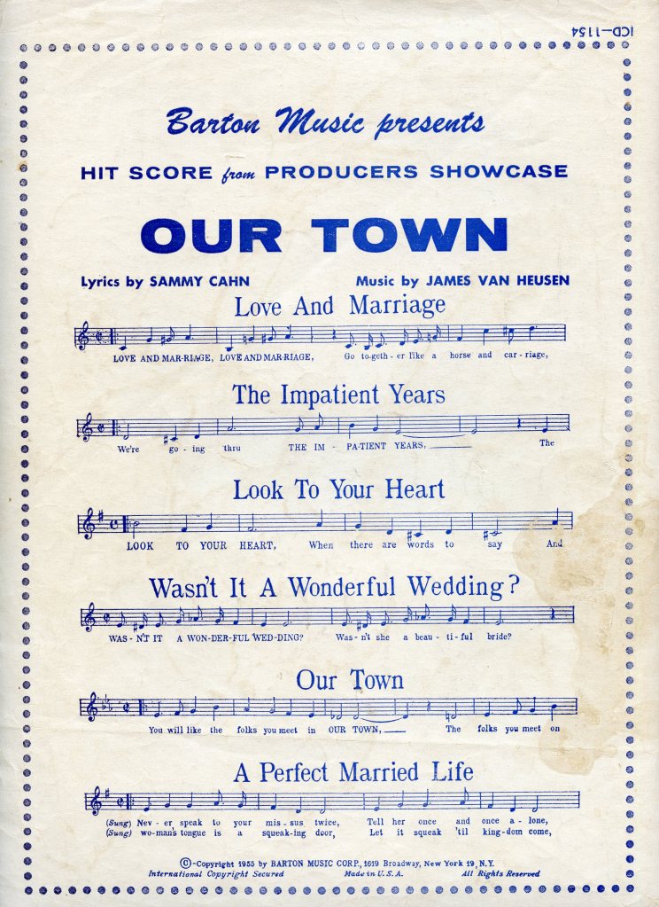 Okay, obviously at some point, quite a few people knew that Frank Sinatra’s 1955 hit song, “Love and Marriage” (commonly recognized as the theme song for “Married… with Children”) was originally composed for and featured in a 1955 television musical production of the Thornton Wilder play, “Our Town.” The episode of “Producers Showcase” starred Frank Sinatra as the Stage Manager, as well as Paul Newman and Eva Marie Saint. I myself had no idea until I happened upon this vintage sheet music at a library sale.