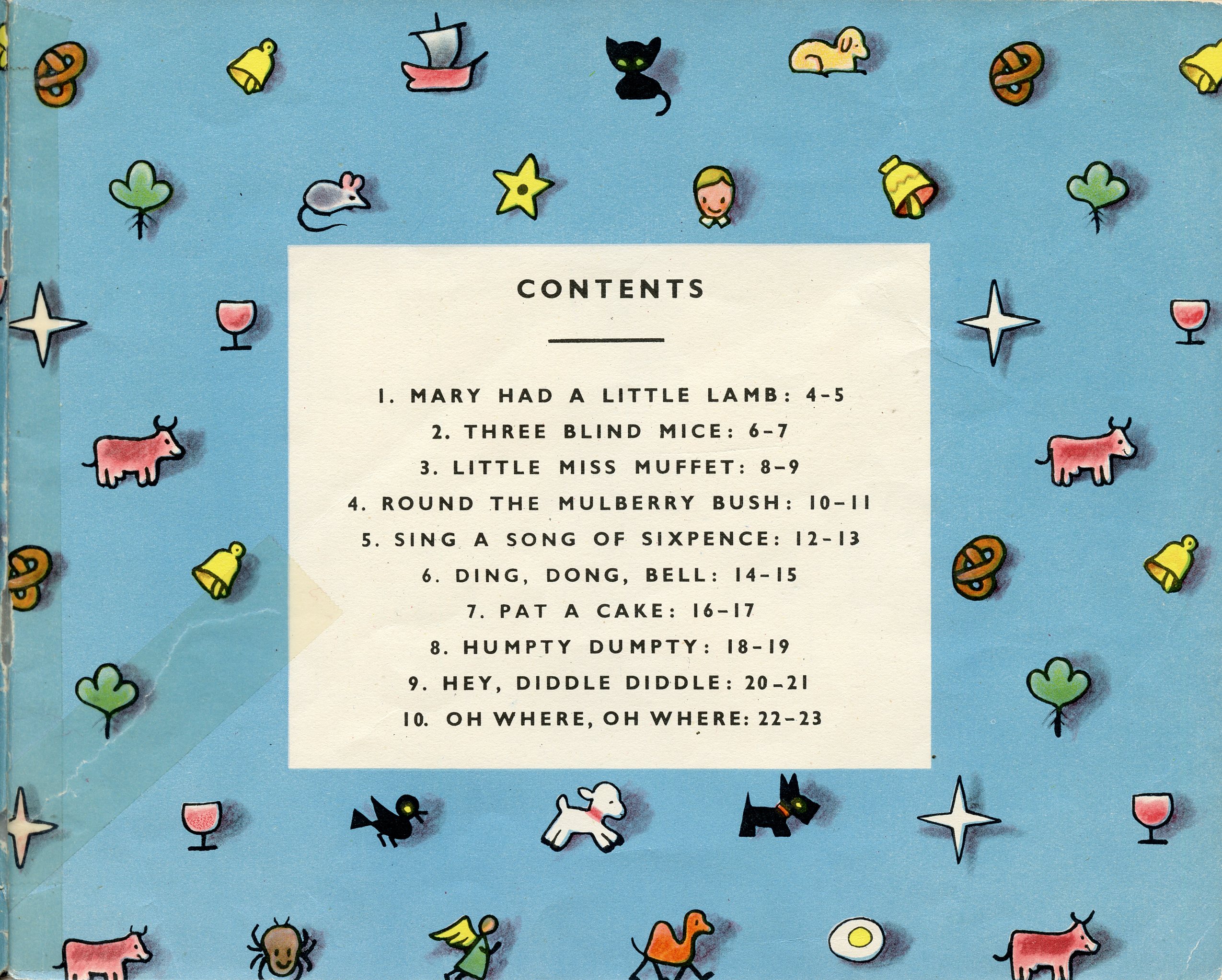 Published in England as #91 in Penguin’s first series of children’s books, the Puffin Picture Books, and sold back in 1951 for “two shillings and sixpence,” “Mary Had a Little Lamb and other Nursery Songs” is a songbook. Each nursery rhyme is offered up in straightforward traditional piano/vocal arrangement, but on each facing page said nursery rhyme comes to life in an illustrated sheet music vignette.