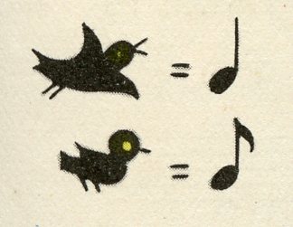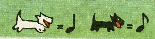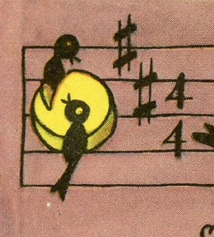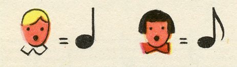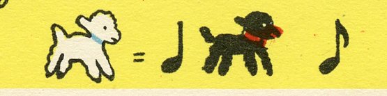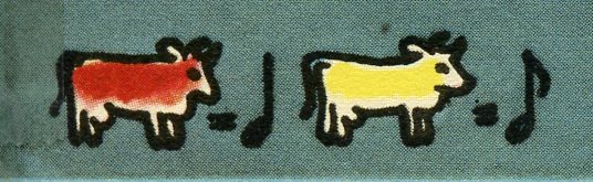 And notice the little cows trotting along the staff (and jumping over the moon). Another playful detail of this collection is how every song comes with a key to explain which figures stand in for the usual symbols for quarter notes and eighth notes.